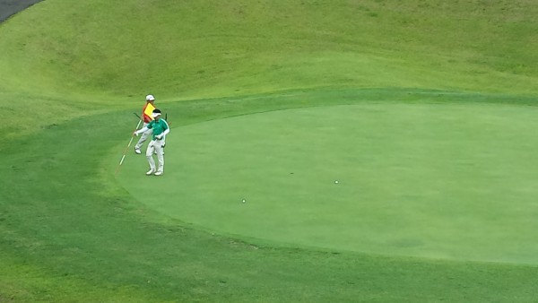 関選手 1オン。10メートル登り1.5m残すも入らずボギー。前半9ホールはイーブンで折り返し。